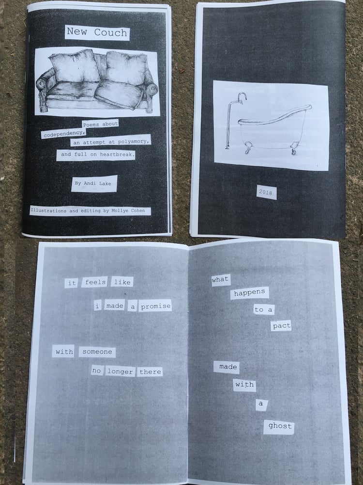 A collection of poems dealing with codependency, an attempt at polyamory and full on heart break. Hand drawn cover illustrations by Mollye Cohen. All poems collaged by hand. Pictured, front cover, back cover and one poem.